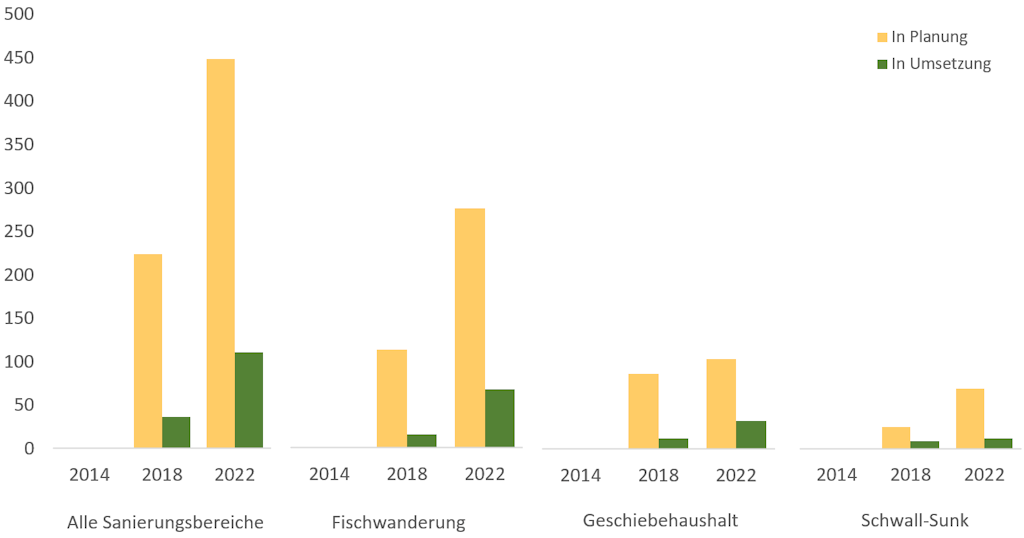 Les cantons sont tenus de rendre compte à la Confédération de l’état d’avancement des mesures d’assainissement tous les quatre ans. La dernière évaluation des données fournies par les cantons recense 111 projets en cours de réalisation ou déjà mis en œuvre à la fin de l’année 2022 sur le millier soumis (env. 10 %), et quelque 450 projets (45 %) en cours de planification. Une comparaison avec la première période (2014-2018) fait apparaître un doublement global du rythme de mise en œuvre.