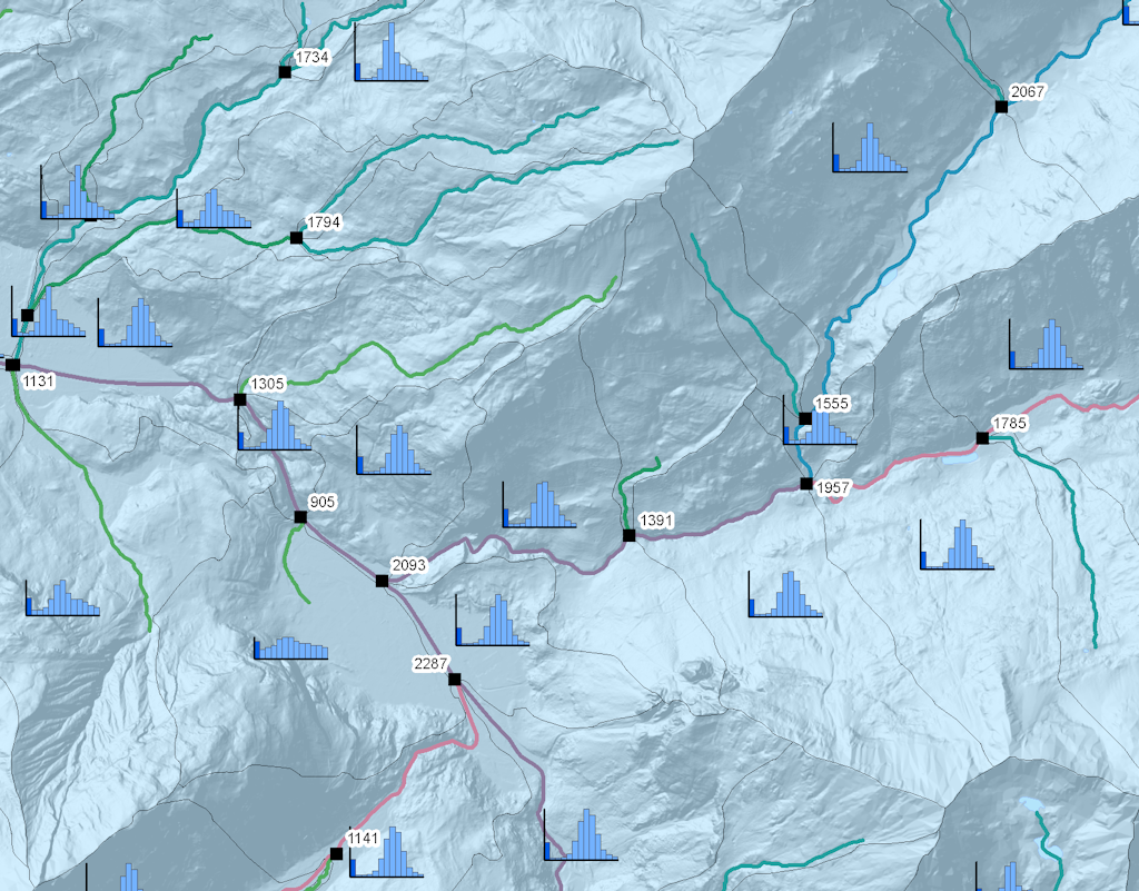 Les bassins versants des stations de mesure et leurs paramètres, tels que la taille, l'altitude, la pente ou la couverture du sol, revêtent une grande importance dans l'évaluation des données hydrologiques enregistrées en Suisse. Les utilisateurs disposent d'un jeu de géodonnées avec ces informations, ce qui leur évite de rechercher chaque paramètre individuellement dans un système d'information géographique (SIG).