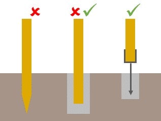L’utilisation d’éléments en béton ou en acier permet d’éviter un contact direct du bois de construction avec la terre. Il est possible, par exemple, de fixer les pieux en bois sur une base en acier et de poser une façade en bois à une distance d’au moins 30 cm du sol.