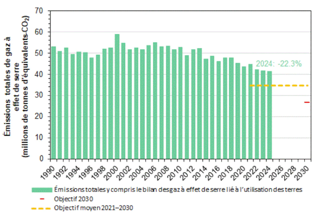 Suite au rejet de la révision totale de la loi sur le CO2 en juin 2021, le Parlement a adopté une réglementation transitoire valable jusqu'à fin 2024. Celle-ci prévoyait une réduction supplémentaire des émissions de gaz à effet de serre de 1,5 % par an d'ici 2024 par rapport à 1990. Au moins 75 % de cette réduction devaient être atteints par des mesures prises en Suisse.