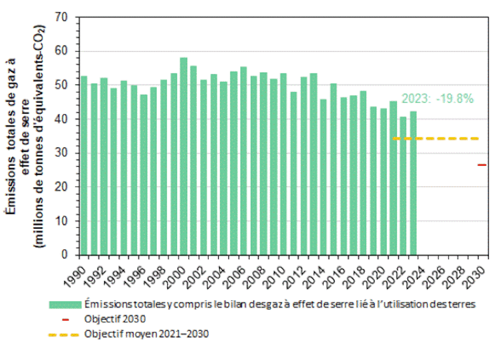 L’objectif annuel d’une réduction d’au moins 50 % d’ici 2030 par rapport à 1990 est cohérent avec l’objectif moyen d’une réduction d’au moins 35 % sur la période 2021–2030. Pour examiner la réalisation de l’objectif, les données ne sont pas corrigées des variations météorologiques. Par conséquence, l’objectif moyen joue un rôle important, car il intègre les fluctuations annuelles des émissions.