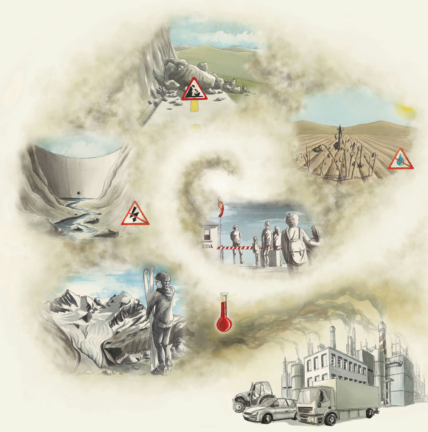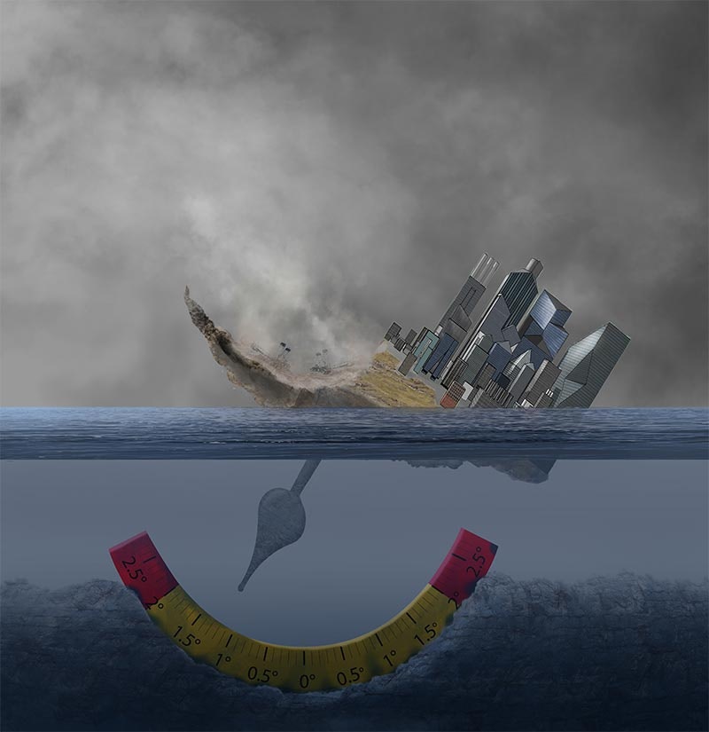 Bien qu’elles ne figurent pas sur le podium, les images arrivées en quatrième et cinquième positions méritent elles aussi d’être mentionnées. Avec son image «Klima in Schieflage», David Hug a créé une métaphore à la fois sombre et belle d’une menace provoquée par le réchauffement de la Terre: un pendule qui se balance dangereusement sous l’influence des activités humaines nuisibles à l’environnement, entraînant ainsi une ville dans la mer. La réalisation de Remo Hiltebrand, «Klimaschmutz», arrivée en cinquième place, s’adresse davantage à un jeune public. L’illustration dans le style BD raconte des histoires «rock» sur les causes et les conséquences des changements climatiques.