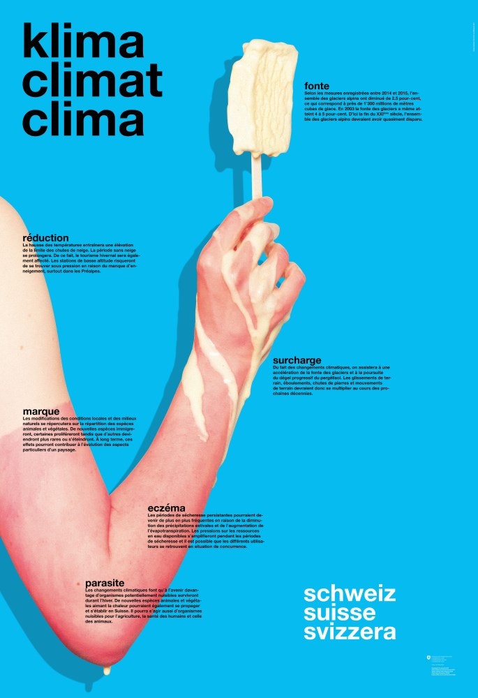Selon Mike S. Schäfer, l’image «RELATIVISE!», qui a remporté le concours, fait ressentir de manière sensorielle les changements climatiques, elle «fait mal» et montre que les les effets nous touchent personnellement. C’est cette sensation physique que Colin Droz et Luca Mengisen veulent provoquer avec leur sujet — un bras brûlé par le soleil sur lequel coule une glace fondue, avec des couleurs très contrastées. Le ressenti dans sa propre chair doit sensibiliser le public à l’environnement et à la problématique mondiale.