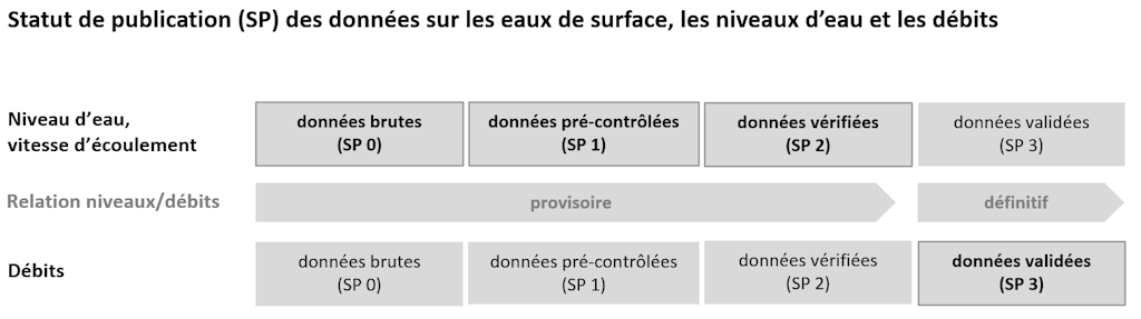 Les données brutes sont des données non vérifiées. Dans les jours qui suivent, elles sont vérifiées et corrigées une première fois. Après ce processus, on parle de données vérifiées publiées. Après une année révolue, un nouveau contrôle est effectué pour vérifier la relation niveau/débit en faisant intervenir des mesures supplémentaires sur le terrain. Au besoin, des corrections peuvent alors être apportées. Les données ayant subi cette nouvelle étape de contrôle sont qualifiées de données validées publiées.