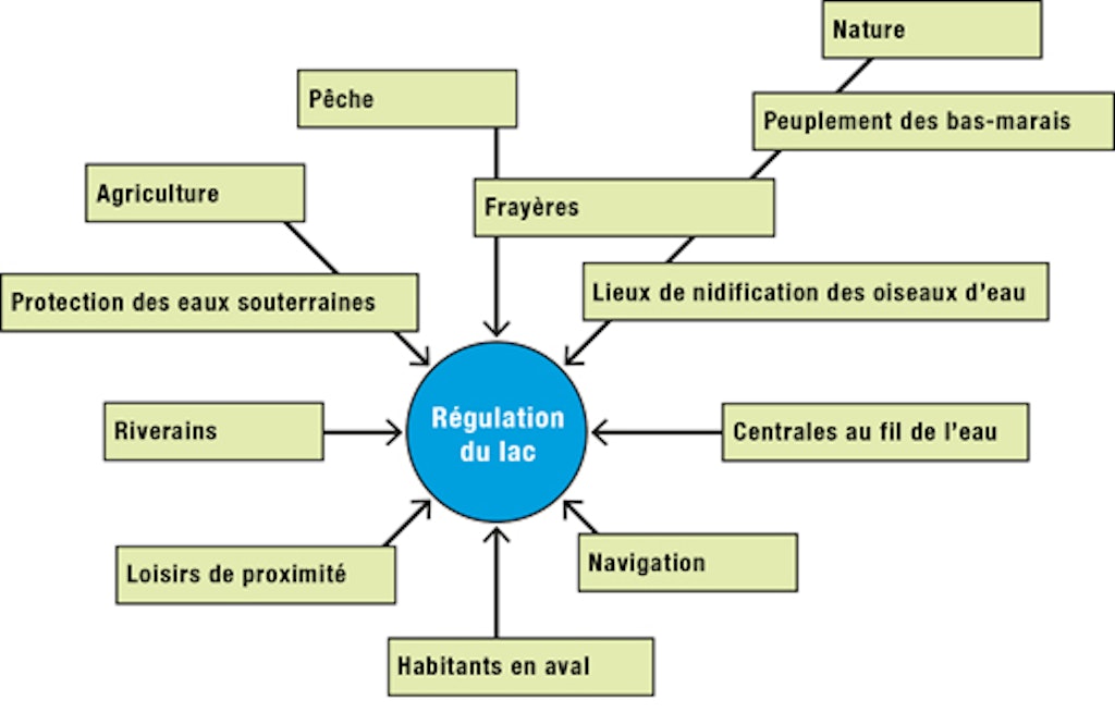 Ainsi, il est préférable pour la faune et la flore que les lacs conservent au printemps leurs niveaux naturels, c'est-à-dire non régulés. Or c'est précisément à cette saison que les eaux de certains lacs doivent être maintenues à un bas niveau afin de mieux absorber la fonte des neiges. En hiver, la navigation fluviale a besoin de niveaux suffisamment hauts, tandis que l'entretien des surfaces marécageuses riveraines des lacs exige des niveaux relativement bas en automne comme en hiver. De leur côté, les agriculteurs et les exploitants de centrales hydroélectriques en aval des lacs ont tout intérêt à ce que les conditions hydrologiques soient aussi constantes et équilibrées que possible. En cas de crue, les riverains des lacs souhaitent voir les réservoirs d'eau se vider le plus possible, ce qui fait croître le risque d'inondation en aval.