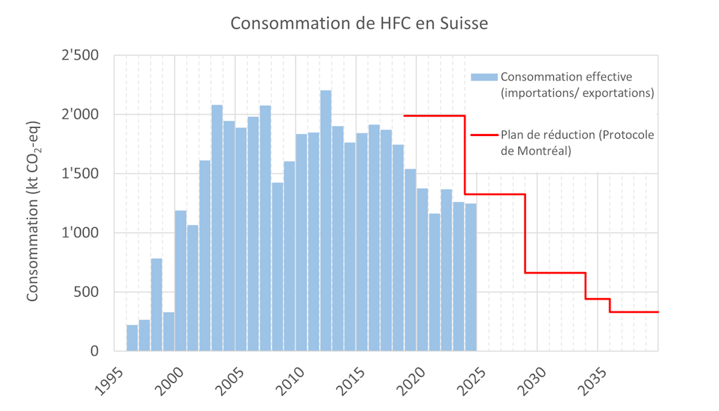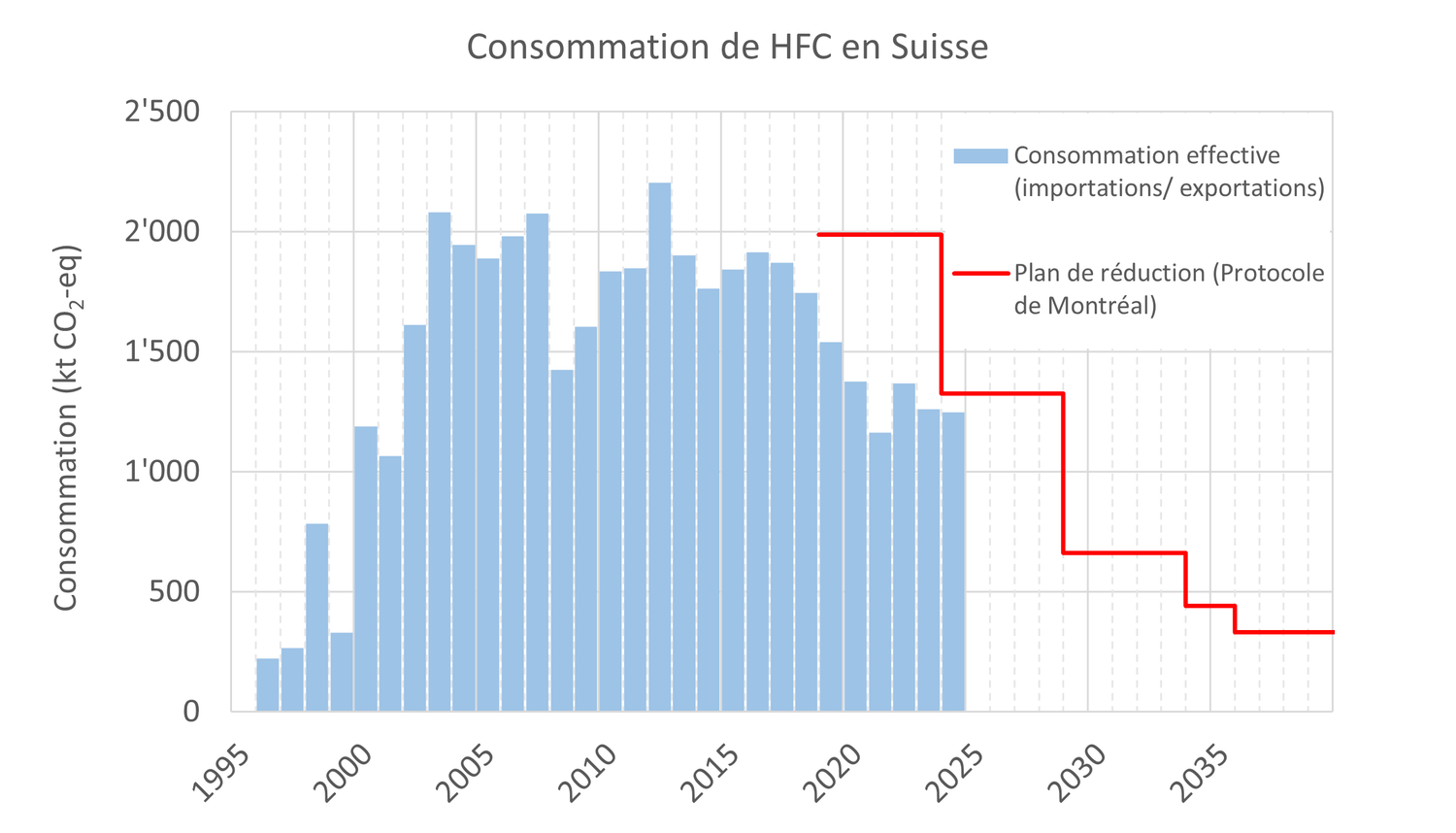 En Suisse, le respect des engagements internationaux est garanti par les dispositions correspondantes de l’ordonnance sur la réduction des risques liés aux produits chimiques (ORRChim). L’ORRChim réglemente à son annexe 1.4 la fabrication, la mise sur le marché ainsi que l’emploi des substances appauvrissant la couche d’ozone et, à son annexe 1.5 (« Substances stables dans l’air »), les hydrofluorocarbures partiellement halogénés (HFC) conformément à l’Amendement de Kigali. Ces derniers ne peuvent notamment être utilisés que lorsqu’il n’existe, selon l’état de la technique, aucune solution de substitution. La trajectoire de réduction illustrée dans le graphique montre la diminution progressive visée de la consommation des HFC.
