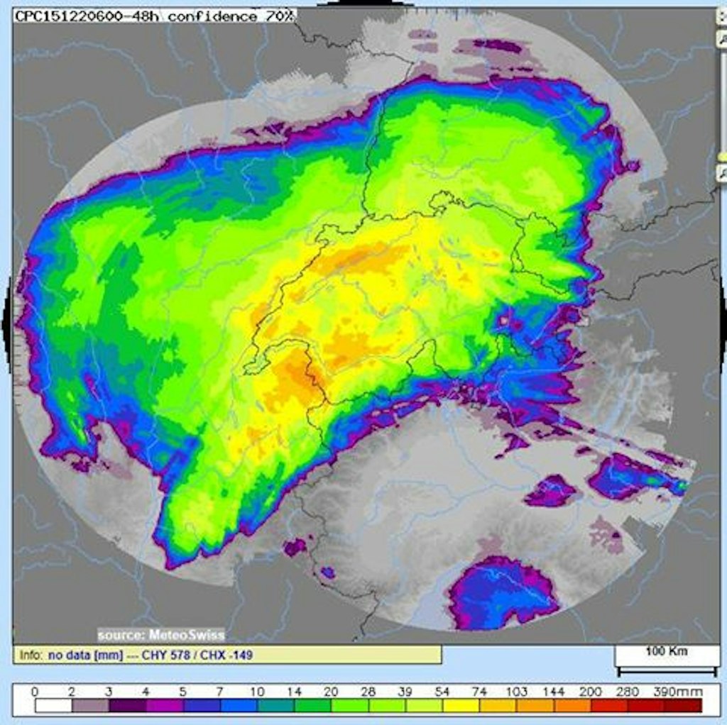 Image radar du 2 mai 2015 : somme des précipitations en 48 heures (source : MétéoSuisse)
