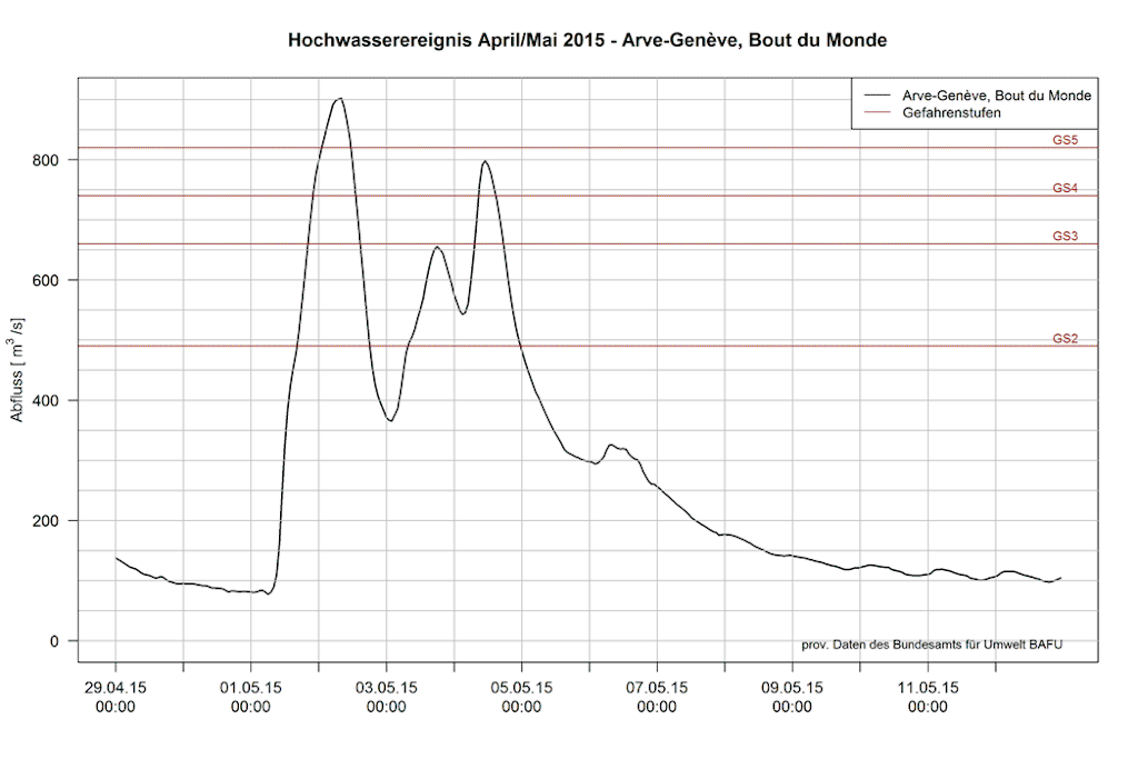 05.06.2015 - Rapport hydrologique spécial de l'Office fédéral de l'environnement du 26 mai 2015 Les précipitations exceptionnellement abondantes des 2 et 3 mai 2015 et des jours suivants ont entraîné une très forte hausse des lacs et cours d’eau au nord des Alpes et dans l’ouest de la Suisse. L'Arve à Genève a affiché des débits encore jamais entregistrés depuis le début des mesures en 1935. De même, le niveau du lac de Neuchâtel a atteint une cote record. À noter : Toutes les données ci-dessous sont provisoires.