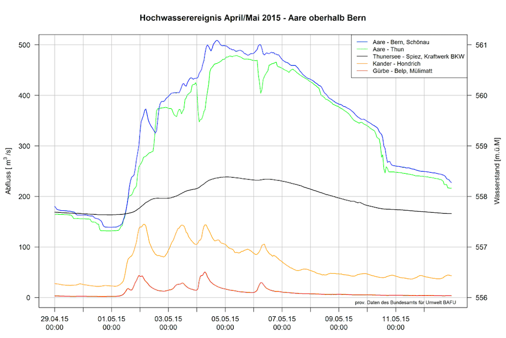 Crue de l'Aar : débits et niveaux d'eau mesurés aux stations de l'OFEV entre le lac de Thoune et Berne et sur la Gürbe du 29 avril au 12 mai 2015.