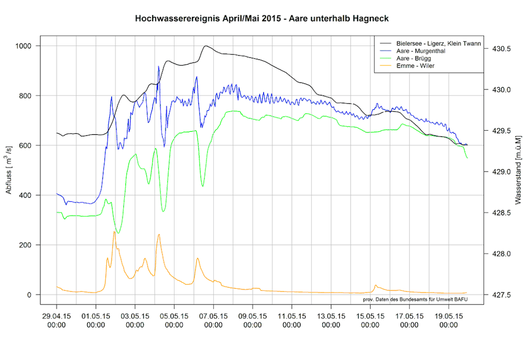 Crue de l'Aar en aval du lac de Bienne : débits mesurés aux stations de l'OFEV du lac de Bienne à Murgenthal et à Emme-Wiler du 29 avril au 19 mai 2015.