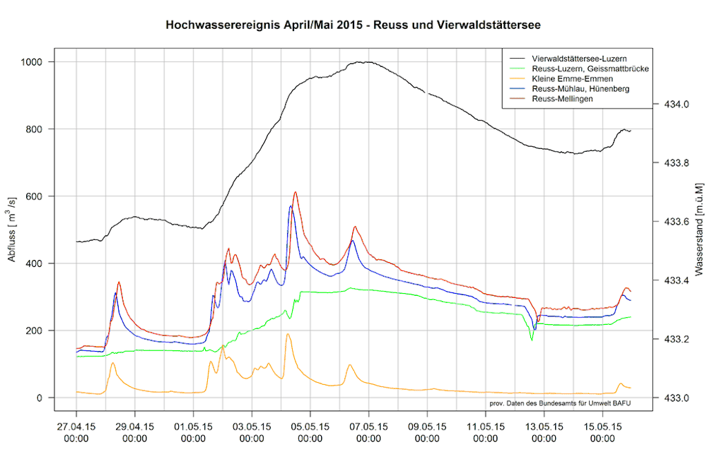 Crues de la Reuss et du lac des Quatre-Cantons : débits et niveaux d'eau mesurés aux stations de l'OFEV du lac des Quatre-Cantons, de la Reuss et de la Petite Emme du 27 avril au 15 mai 2015.