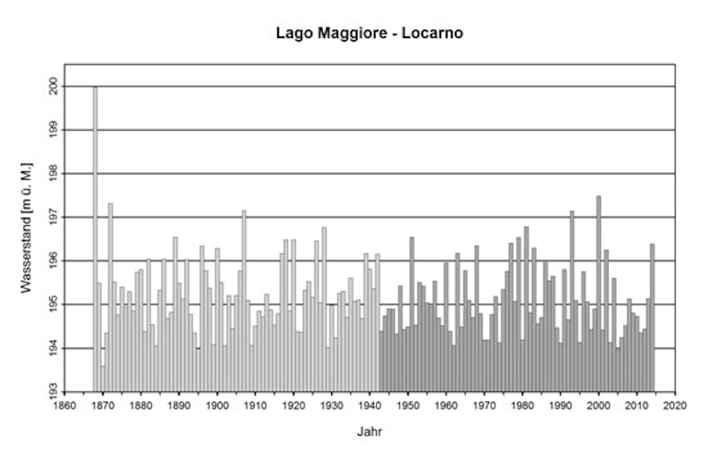 Même si, au cours des dernières années, une telle hausse des niveaux des lacs ne s'était plus produite aussi fréquemment, il ne s'agit pas d'un un événement rare au Tessin (cf. graphique ci-dessous) :
