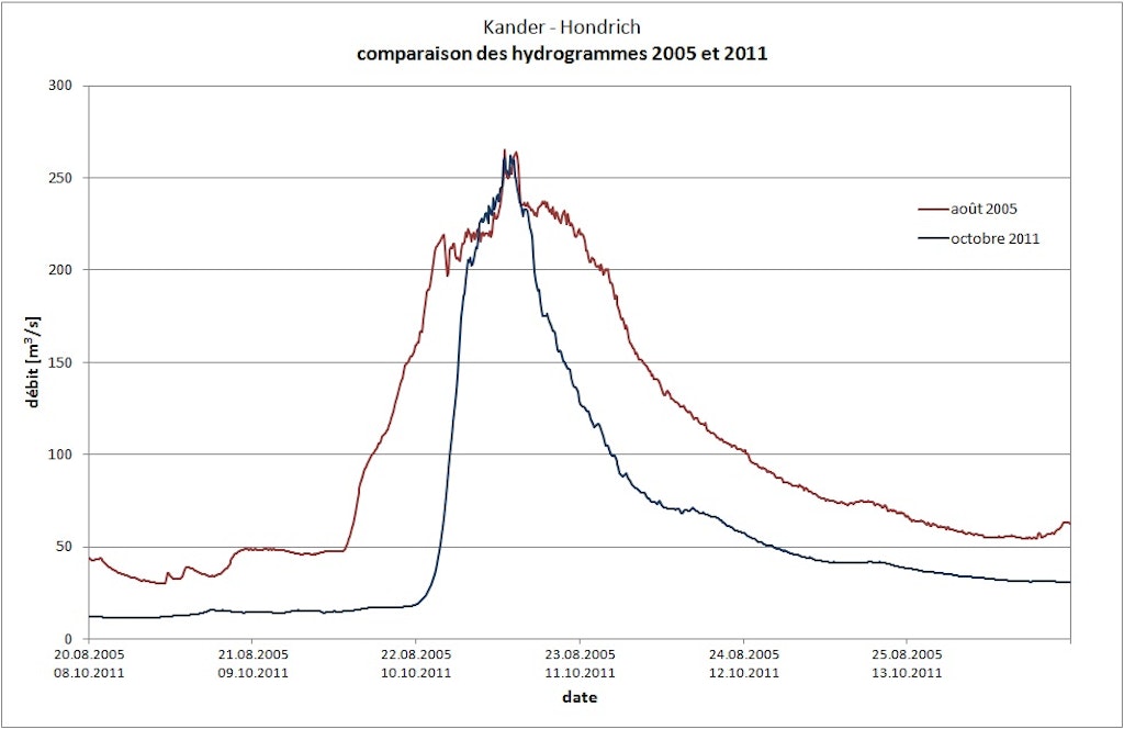Les niveaux de la Kander et de la Lütschine dans l'Oberland bernois sont montés en quelques heures presque au niveau du mois d'août 2005. Ainsi, le lundi à midi, un pic de débit de 265 m3/s a été mesuré dans la Kander à Hondrich, soit un niveau supérieur à un événement centennal (HQ100, période de retour >100 ans). Un HQ100 est un débit de crue qui est atteint ou dépassé en moyenne une fois tous les cent ans. Le pic de 265 m3/s établit un nouveau record pour un mois d'octobre depuis le début des mesures en 1981. Le record absolu de débit, à savoir 273 m3/s, a été mesuré le 22 août 2005. Le pic d'octobre 2011 s'est toutefois produit en un temps nettement plus court qu'en août 2005.