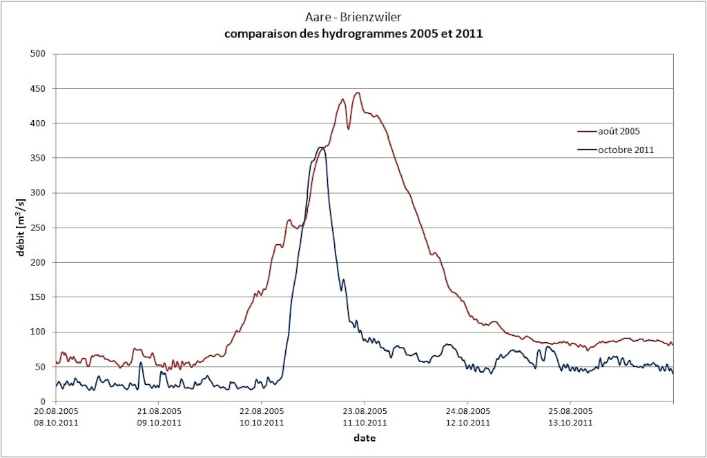 11.10.2011 - Rapport hydrologique spécial de l’Office fédéral de l’environnement (OFEV) Lundi 10 octobre 2011, un grand nombre de cours d’eau sont sortis de leur lit dans l’Oberland bernois, en Suisse centrale et au Valais. Différentes stations de mesure de l’Office fédéral de l’environnement ont enregistré de nouveaux records pour octobre. Les images des débits tor-rentiels rappellent les crues d’août 2005. Plusieurs voies ferrées et routes ont été coupées, entre autres dommages importants. Remarques: les données de mesure mentionnées sont toutes provisoires.