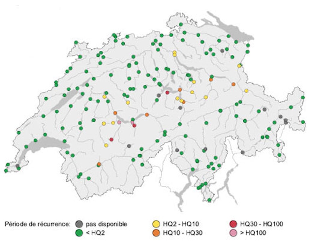 L'OFEV observe et mesure les niveaux des cours d'eau et des lacs suisses, ainsi que des nappes phréatiques. Ces données ajoutées au bulletin de vigilance dangers naturels et au bulletin hydrologique sont actualisés en permanence et publiés sur Internet.