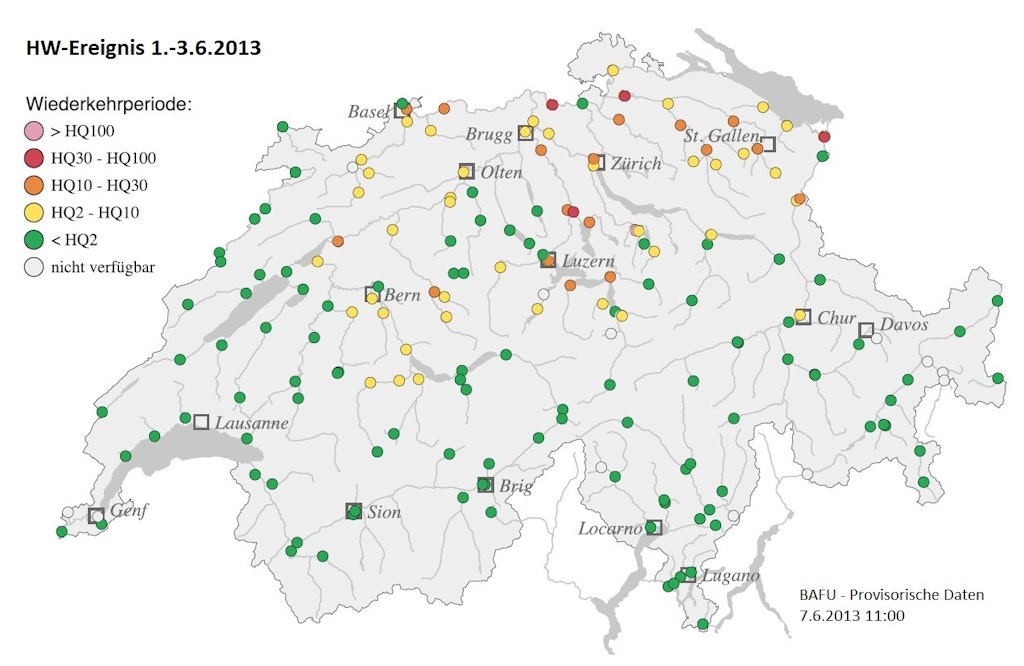 04.06.2013 - Rapport hydrologique spécial du 3 juin 2013 de l’Office fédéral de l’environnement (OFEV) Durant le week-end des 1er et 2 juin 2013, d’intenses précipitations ont provoqué une rapide montée des eaux au nord des Alpes. De nombreuses stations de l’OFEV y ont enregistré des crues bisannuelles, voire décennales. Dans certaines rivières de Suisse orientale, de même que dans le Rhin supérieur, on a même mesuré des débits qui ne reviennent statistiquement que tous les 30 ans. L’événement rappelle les intempéries de mai 1999, d’août 2005 et d’août 2007, mais n’a pas atteint les mêmes records. Remarque: Toutes les données indiquées sont provisoires.