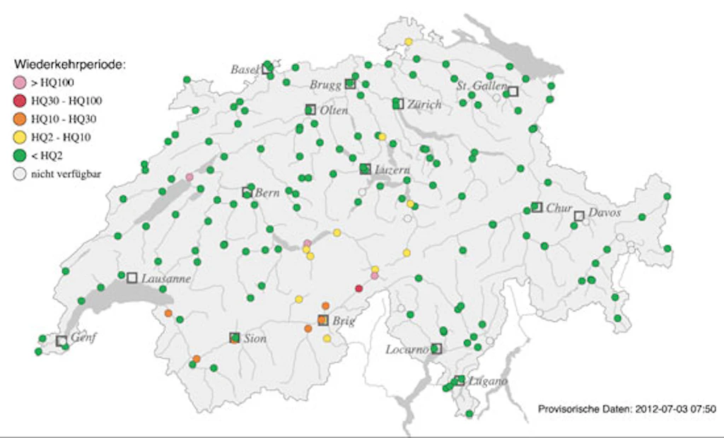 03.07.2012 - Rapport hydrologique spécial de l’Office fédéral de l’environnement (OFEV) Des orages et de fortes précipitations ont fait monter les niveaux et les débits des cours d'eau du Valais et des régions du Grimsel et du Gothard. De nombreuses stations de l'OFEV y ont enregistré des crues bisannuelles, voire décennales. A Reckingen, le débit du Rhône a même atteint une valeur qui n'intervient statistiquement que tous les 30 ans. Remarques: les mesures mentionnées sont toutes provisoires.