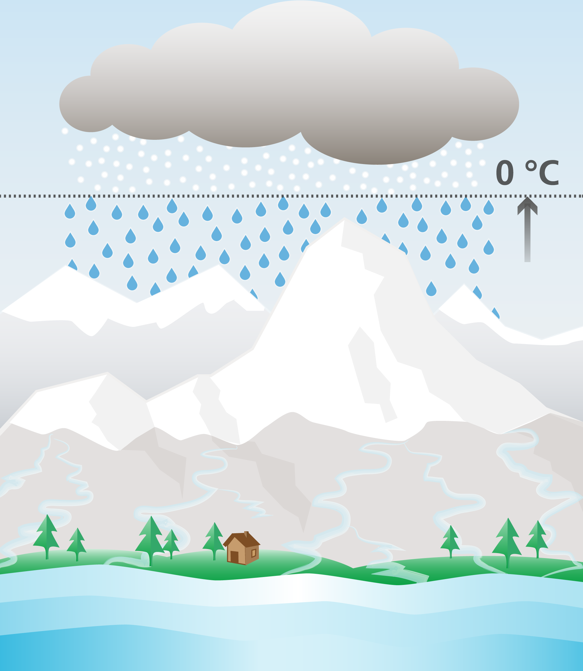 - précipitations abondantes et persistantes, limite des chutes de neige élevée et, partant, pluie jusqu’à de hautes altitudes, ce qui fait fondre la neige.
