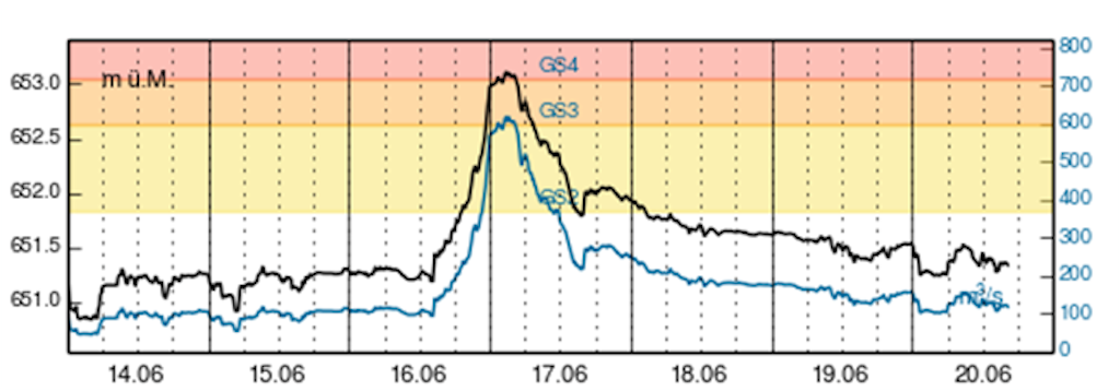 Comme l’ont montré les orages des 24 et 25 juin, de nouvelles précipitations peuvent actuellement encore entraîner une rapide montée des eaux. Ainsi, le 24 juin, la Minster a connu à Euthal une crue qui ne survient en moyenne qu’une fois en dix à trente ans. La plupart des lacs affichent également toujours un niveau élevé. Il faudra plusieurs semaines, selon les conditions météorologiques estivales, pour que le lac de Constance retrouve un niveau normal pour la saison. En conséquence, le Rhin en aval du lac restera lui aussi en crue encore quelque temps.