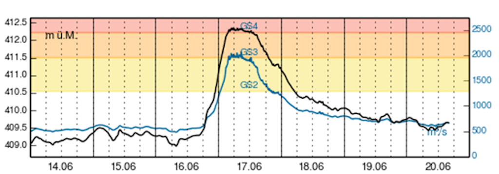 Le lac de Constance a atteint son niveau le plus élevé (397,35 m s.m. pour le lac Supérieur, à Romanshorn, et 397,03 m s.m. pour le lac Inférieur, à Berlingen) mardi 21 juin et connaît depuis lors une lente décrue. La crue du mois de juin est la plus importante enregistrée depuis mai 1999, période à laquelle le niveau du lac de Constance était encore 50 cm plus haut. Le lac avait débordé pour la dernière fois en juin 2013 en atteignant un niveau maximum de 397,04 m s.m. à Romanshorn et de 396,83 m s.m. à Berlingen, soit des valeurs nettement inférieures à celles relevés dernièrement. Statistiquement, les crues de juin 2016 correspondent à un événement qui survient environ tous les dix ans au lac de Constance.