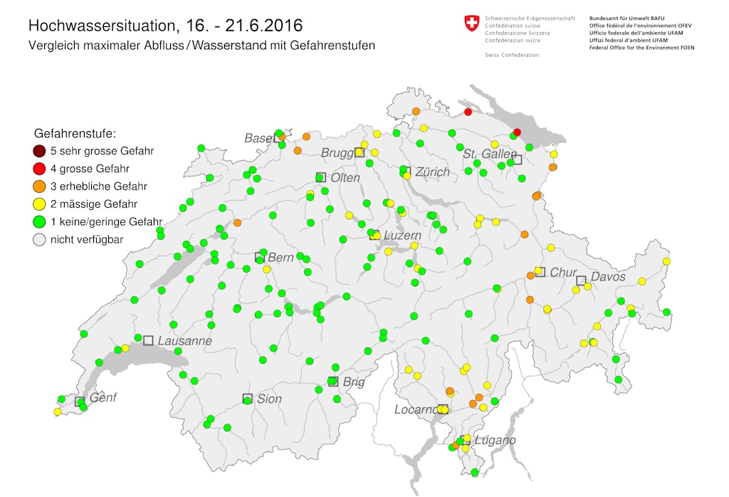 01.07.2016 - À la mi-juin, de fortes précipitations ont provoqué une élévation rapide du niveau de nombreux lacs et rivières de Suisse. Bon nombre de stations de mesure de l’OFEV ont enregistré des crues survenant une fois en deux à cinq ans. Dans certains cours d’eau, tels que la Seez à Mels ou le Rhin à Diepoldsau, on a observé des débits encore plus rares. Le lac de Constance a lui atteint son niveau le plus élevé depuis 1999.