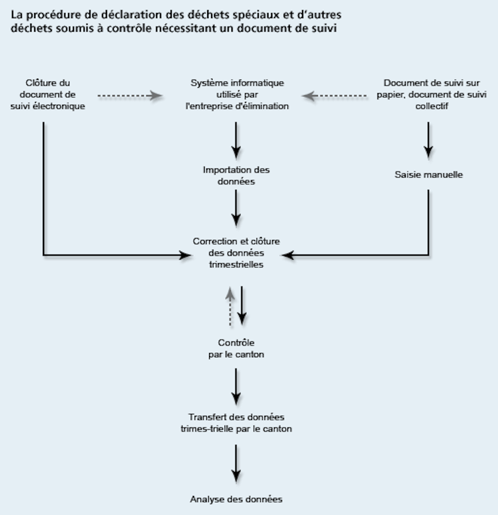 Les informations concernant les déchets spéciaux et d'autres déchets soumis à contrôle nécessitant un document de suivi qui sont réceptionnés peuvent être saisies manuellement ou à l’aide d’une interface servant à importer les données sous forme de fichier. Si des documents de suivi électroniques sont utilisés, la déclaration peut être générée directement à partir des informations figurant sur le document de suivi. Les informations sont contrôlées par les services cantonaux compétents.