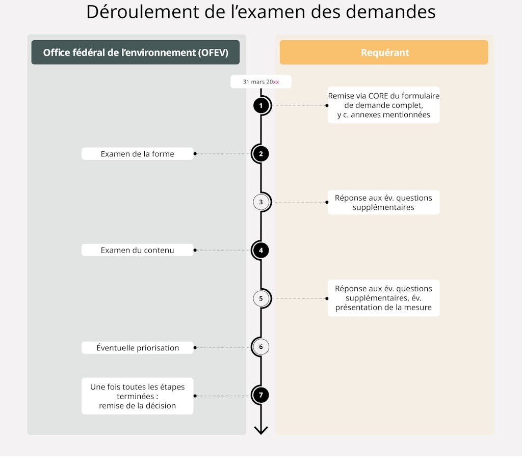 - Si le montant total des demandes d’encouragement déposées jusqu’à la date butoir dépasse les moyens disponibles pour l’année civile correspondante, les demandes qui respectent les critères d’exigence liés à la forme et au contenu sont évaluées sur la base de l’ordre de priorité fixé à l’art. 127l de l’ordonnance sur le CO2.