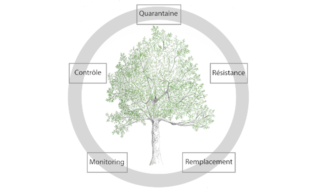 - Monitoring : suivi de l’évolution de la maladie et observation des répercussions de celle-ci sur le marché du bois ainsi que sur la stabilité du bois et des arbres