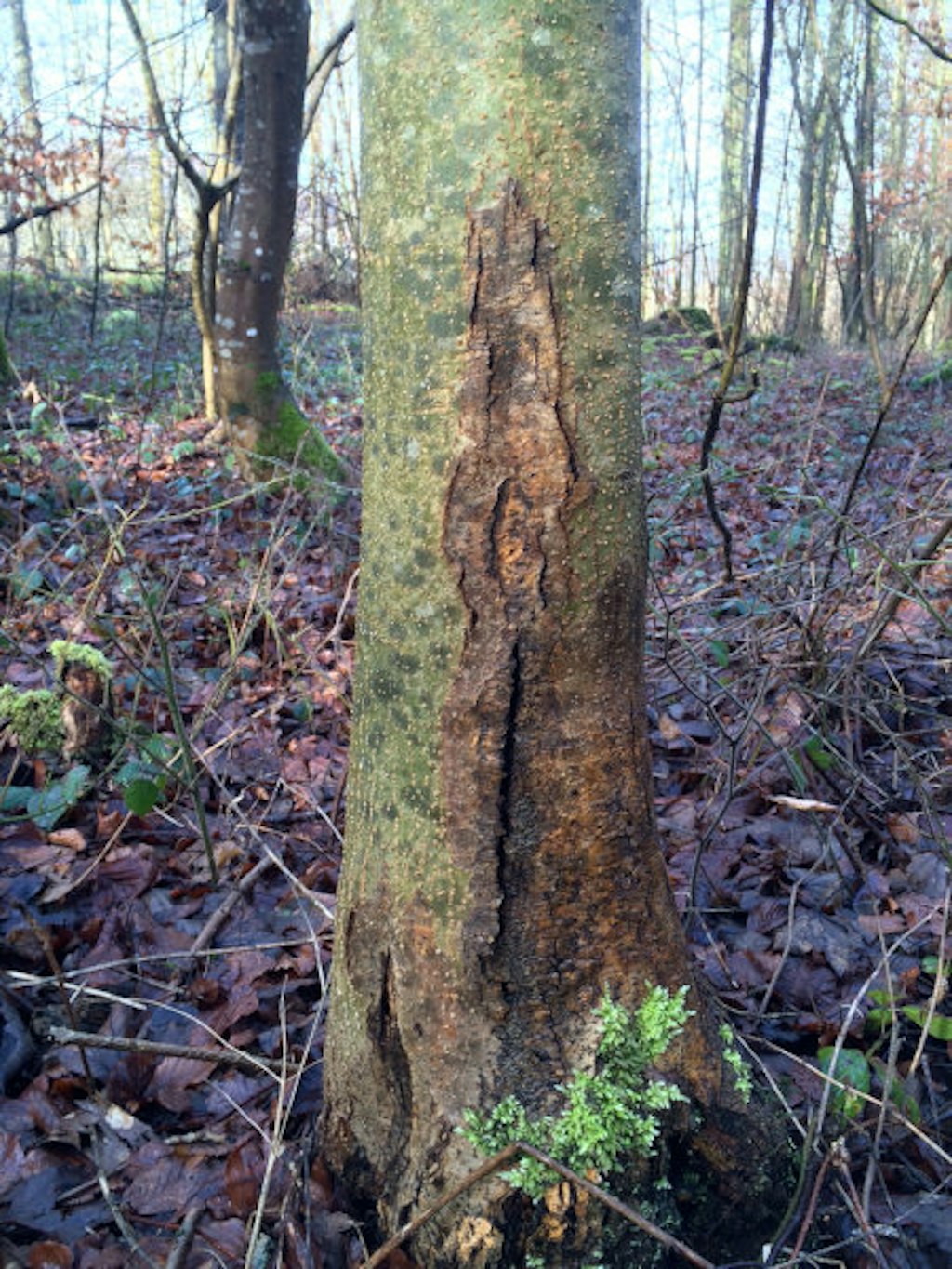 - Dégager le collet de sa végétation ou de sa mousse et repérer la présence éventuelle d’écorce affaissée ou lâche et/ou de suintements.