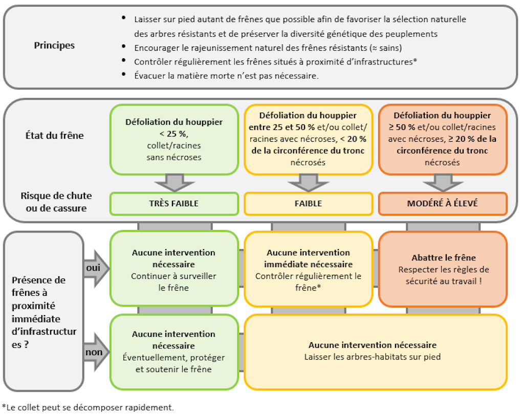 La gestion des frênes infestés dépend pour beaucoup du site et du risque encouru par les êtres humains et les infrastructures concernés. Le WSL a élaboré le schéma suivant (Heinzelmann et al, La Forêt 9/2023), qui peut aider à la prise de décision concernant la gestion des frênes touchés par le dépérissement (du perchis au vieux bois). Il ne tient toutefois pas compte du risque de cassure des branches mortes.