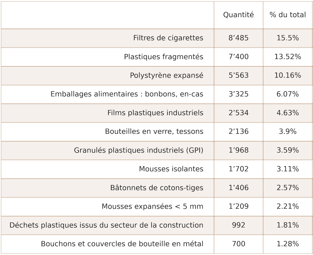 Sur les seules rives des lacs et cours d’eau suisses, 54 744 objets ont au total été collectés et documentés. Parmi les nombreux types de déchets, le mégot de cigarette occupe clairement la première place. Les bénévoles en ont ramassé pas moins de 8485. Les plastiques fragmentés (7400 unités) et les fragments de polystyrène (5563 unités) arrivent respectivement en deuxième et troisième position. Viennent ensuite les emballages plastiques de friandises et d’en-cas (3325 unités) comme les barres chocolatées. Les films plastiques industriels (2534 unités) et les morceaux de bouteilles en verre (2136 unités) se classent respectivement en cinquième et sixième position.