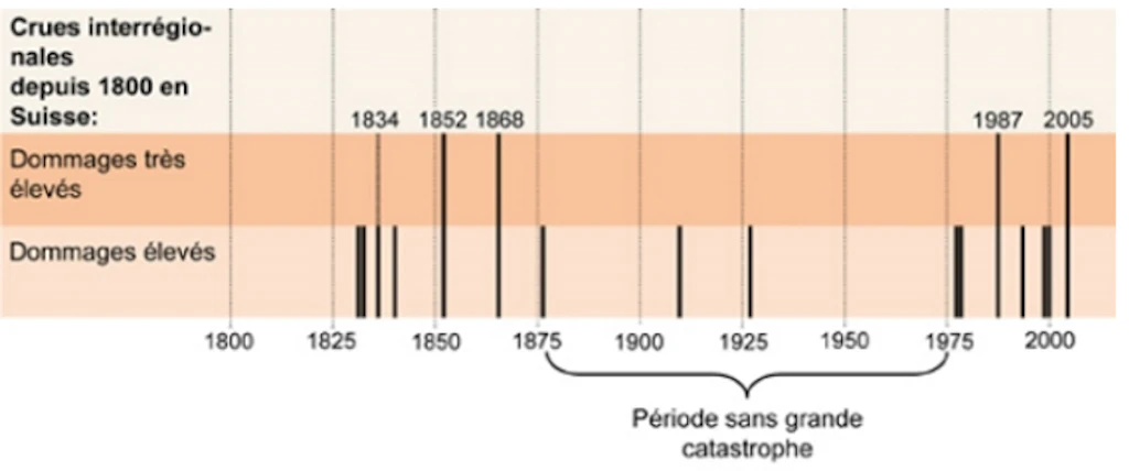 Depuis 1972, l'essentiel des dommages a été causé par un petit nombre de crues exceptionnelles. En revanche, entre 1875 et 1975, la Suisse n'a connu que peu de crues interrégionales de forte ampleur. Le graphique ci-dessous met en évidence cette longue période sans catastrophe naturelle. Pour tirer des conclusions fiables, la période d'observation sélectionnée doit être suffisamment longue. Ce n'est qu'à cette condition que les événements peuvent être placés dans leur contexte historique.