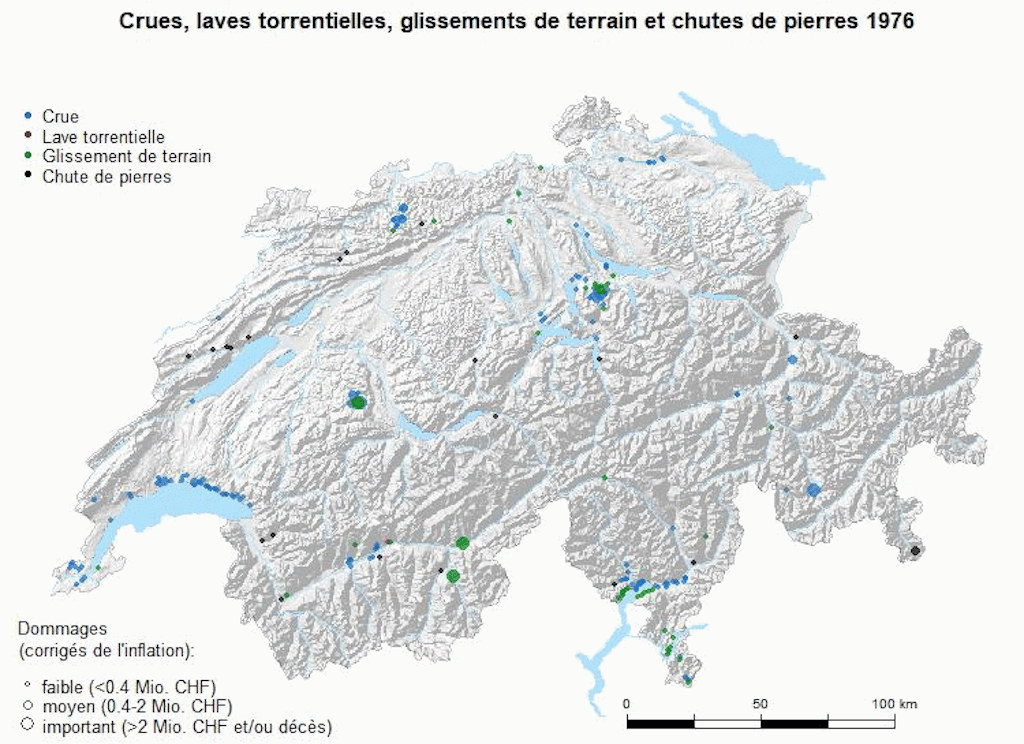 Entre 1972 et 2022, Le coût annuel des dommages en Suisse dus aux crues, aux laves torrentielles, aux glissements de terrain et aux processus de chute s'est élevé en moyenne à environ 305 millions de francs. L’essentiel de ce montant est dû aux crues. L’ampleur d'un dommage dépend de plusieurs facteurs :