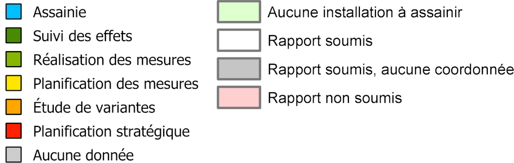 Le rapport actuel (état fin 2022) répertorie 107 installations devant faire l’objet d’un assainissement.