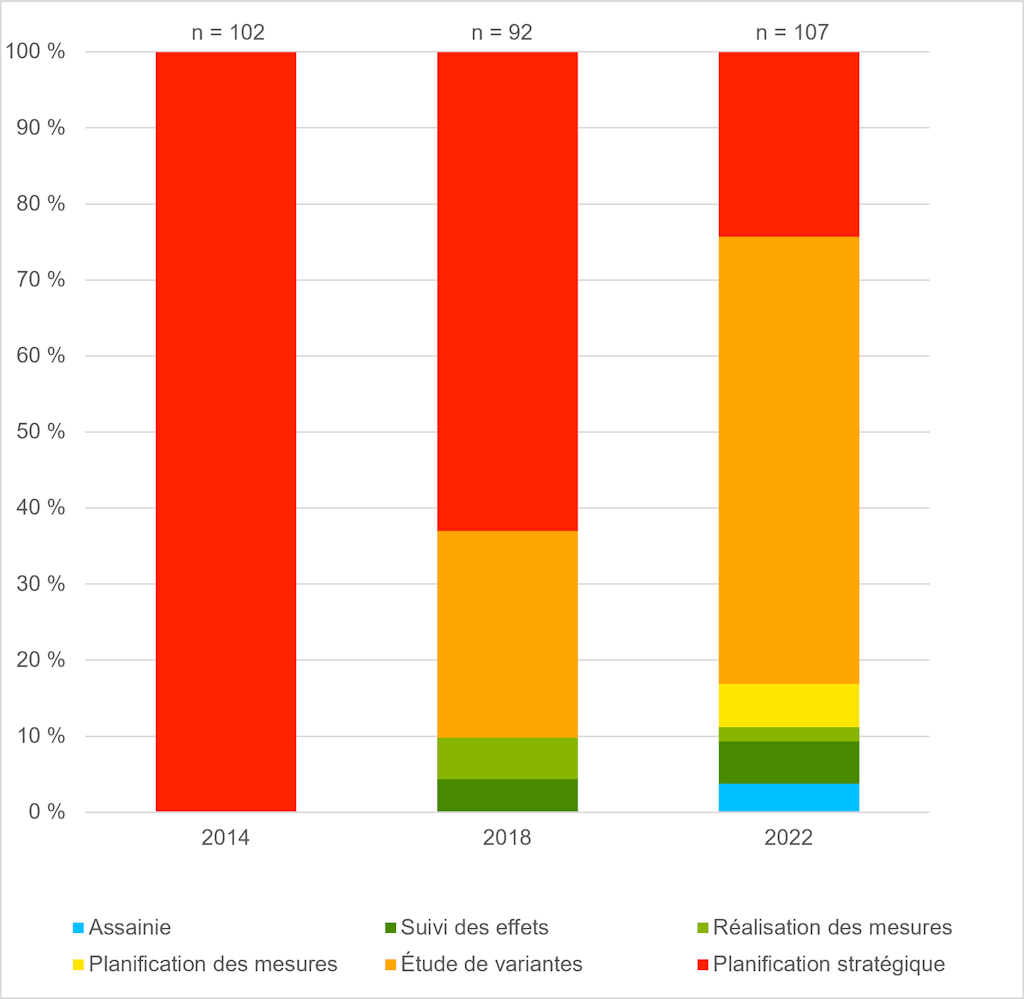 Le nombre de mesures mises en œuvre chaque année a baissé par rapport à la période 2014-2018. Toutefois, fin 2022, les projets d’assainissement avaient débuté pour environ trois quarts des installations.