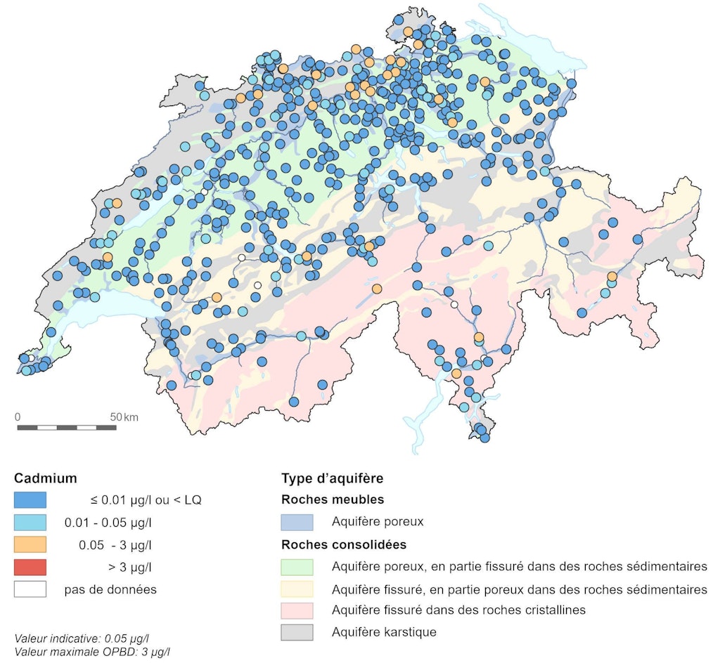 Les concentrations de cadmium sont inférieures à la limite de quantification de 0,01 µg/l dans 80 % des stations de mesure. La valeur maximale de 3 µg/l fixée dans l’OPBD pour l’eau potable n’est dépassée dans aucune station de mesure. Les stations de mesure présentant des concentrations supérieures à la valeur indicative des Instructions pratiques se situent principalement dans l’est du Jura et du Plateau. Quelques concentrations accrues sont enregistrées aux stations de mesure des Préalpes, des Alpes et du sud des Alpes. Plus de 35 % des stations de mesure qui enregistrent des concentrations supérieures à la valeur indicative des Instructions pratiques se trouvent dans un bassin versant dominé par les grandes cultures.