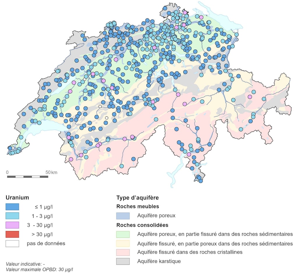 Les concentrations d’uranium sont généralement faibles et inférieures à 3 µg/l. La valeur maximale de 30 µg/l fixée dans l’OPBD pour l’eau potable n’est dépassée dans aucune station de mesure. Sur le Plateau, elles ont tendance à être plus élevées que dans le Jura ou les Préalpes. Les données ne permettent pas de déterminer clairement si ces concentrations accrues sont dues à l’utilisation d’engrais phosphatés contenant de l’uranium ou à la dissolution, du fait de l’exploitation agricole intensive, de l’uranium présent à l’état naturel dans le sol.