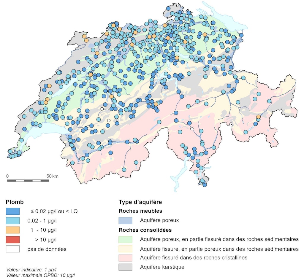 Les concentrations de plomb sont généralement faibles et inférieures à 1 µg/l. La valeur maximale de 10 µg/l fixée dans l’OPBD pour l’eau potable n’est dépassée dans aucune station de mesure. Les concentrations supérieures à la valeur indicative de 1 µg/l sont enregistrées avant tout dans les stations de mesure situées dans les aquifères karstiques du Jura ainsi que dans les aquifères en roches meubles du Plateau.