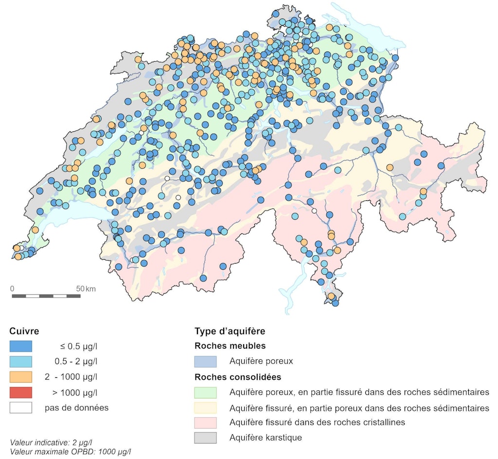 À l’échelle nationale, les concentrations de cuivre sont plus élevées dans le Jura et sur le Plateau que dans les Préalpes et les Alpes où, à quelques exceptions près, elles sont inférieures à 2 µg/l. La valeur maximale de 1000 µg/l fixée dans l’OPBD pour l’eau potable n’est dépassée dans aucune station de mesure.