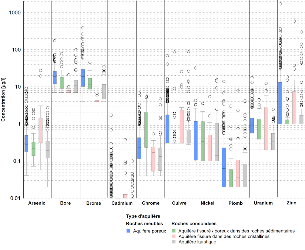 Si les concentrations accrues d’aluminium, d’arsenic, de chrome, de fer, de manganèse, de sélénium et de nickel dans les eaux souterraines sont essentiellement d’origine naturelle (géogène), celles de bore, de brome, de cadmium, de cuivre, de plomb et de zinc sont d’origine tant naturelle qu’anthropique. Pour ces derniers, la valeur de fond naturelle n’a pas pu être déterminée sur la base du jeu de données de l’étude pilote, car la part anthropique mesurée à la plupart des stations de mesure situées dans des aquifères en roches meubles du Plateau était déjà trop élevée pour être distinguée de la valeur de fond naturelle au moyen des méthodes statistiques disponibles (Verweis auf Studie Uni Bern).