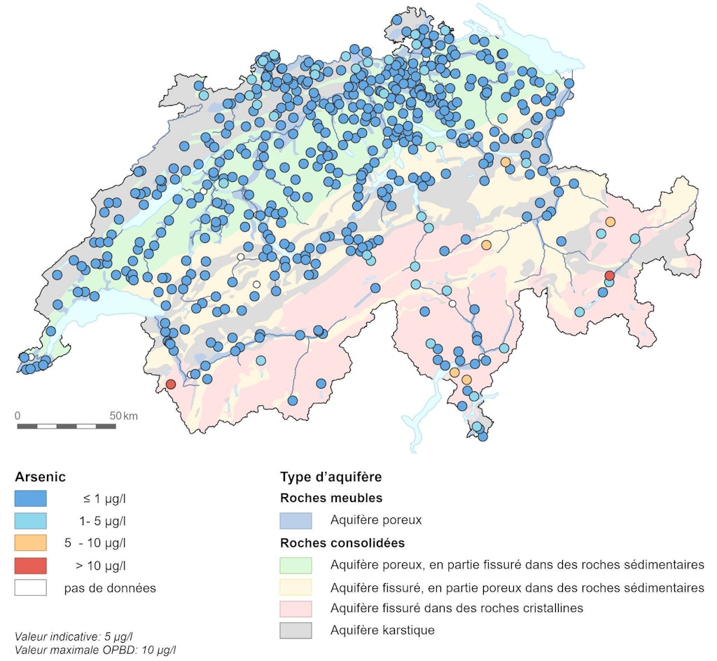 Dans l’ensemble, les concentrations d’arsenic mesurées sont faibles et, sur le Plateau et dans les Préalpes, majoritairement inférieures à 1 µg/l. Des concentrations localement accrues, supérieures à 5 µg/l, sont enregistrées presque exclusivement dans les aquifères fissurés en roches cristallines des Alpes et du sud des Alpes. Elles sont dues à des gisements minéraux naturels et à des roches cristallines à la teneur accrue en arsenic.