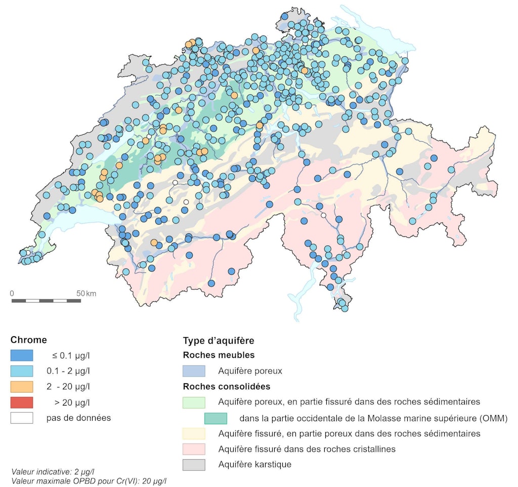 Dans les eaux souterraines, le chrome n’est soluble pratiquement qu’à l’état oxydé hexavalent. À l’exception de quelques concentrations accrues en raison du chrome lié à des particules, comme cela peut se produire, par exemple, dans les aquifères karstiques, on part donc du principe que les concentrations mesurées concernent essentiellement le chrome (VI).