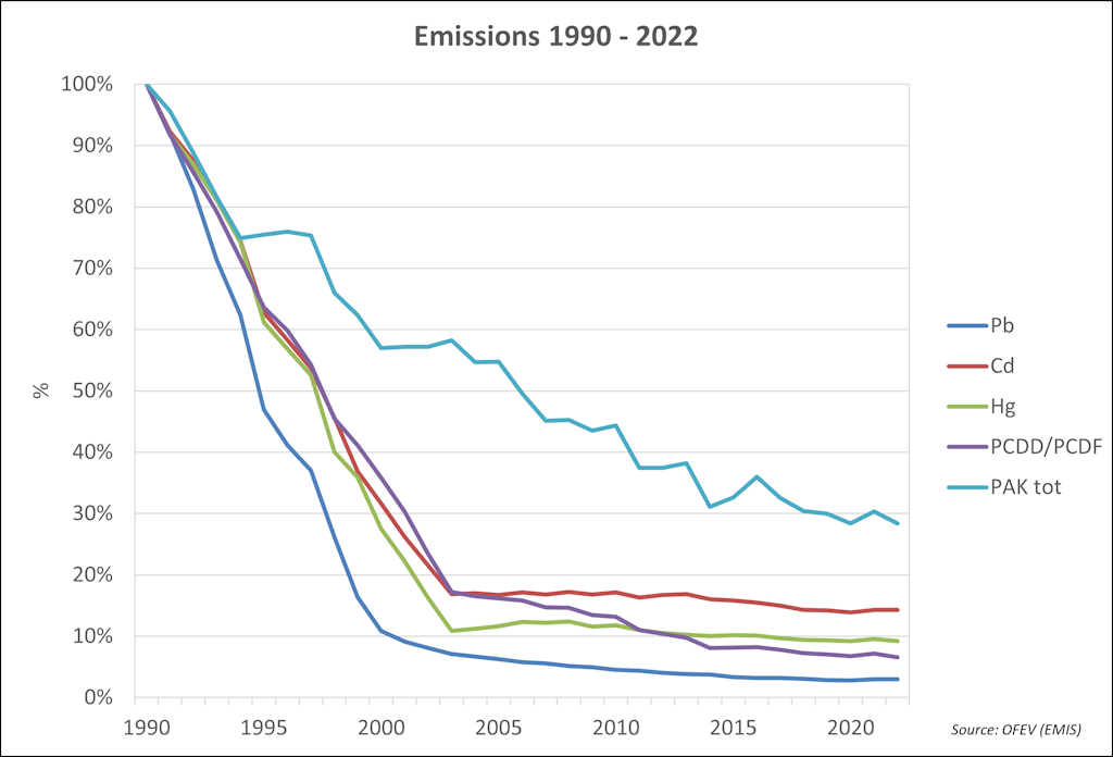 Les émissions de polluants atmosphériques ont diminué en Suisse depuis les années 1990. Les modélisations et les relevés montrent des diminutions de 22% (ammoniac) à 97% (plomb). Ces améliorations sont dues à l’introduction de prescriptions plus sévères avec, pour corollaire, un développement accru de mesures réalisables sur le plan de la technique et économiquement supportables.