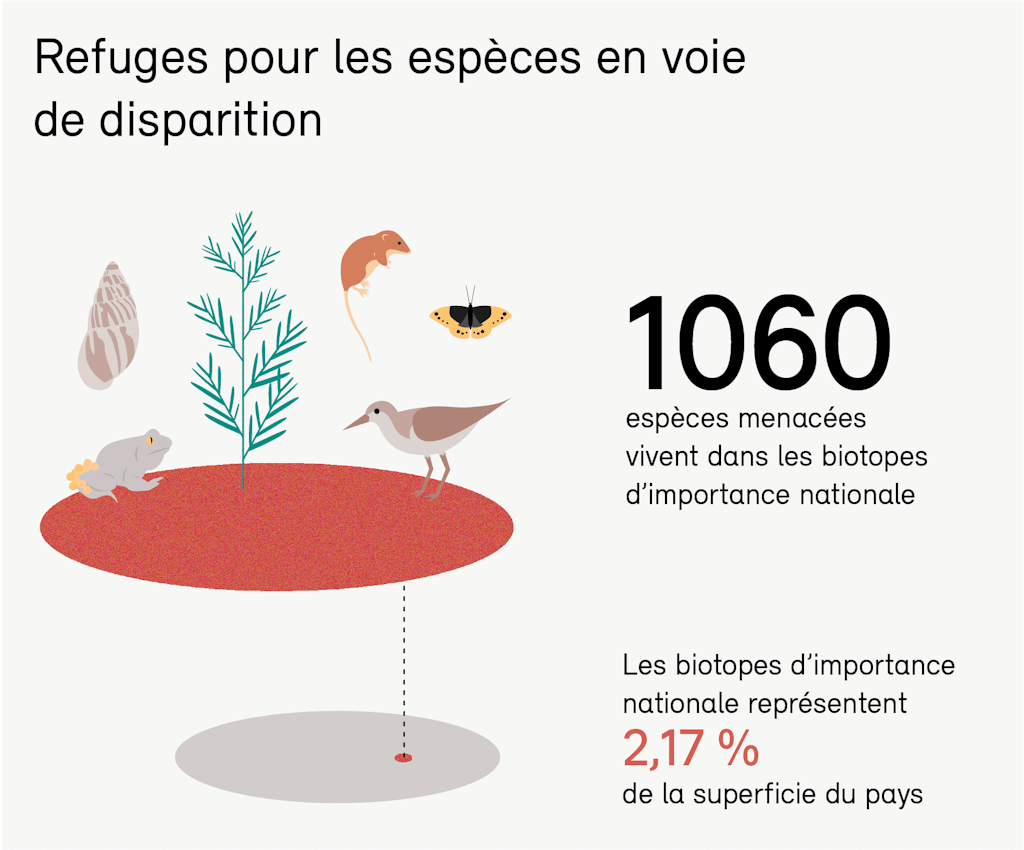 Il existe environ 7000 aires protégées de ce type en Suisse, qui représentent au total une surface à peu près équivalente à celle du canton du Jura. Précieuses, elles abritent les derniers milieux naturels typiques et caractéristiques du pays (voir encadré « Les biotopes d’importance nationale en bref »), qui ont connu un fort déclin au cours des siècles passés.