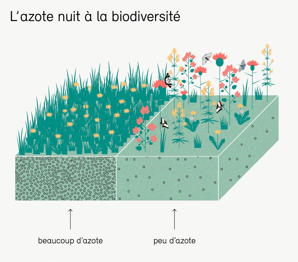 - De même, la teneur en nutriments des prairies et pâturages secs progresse. Les arbres et les buissons s’y développent également.
