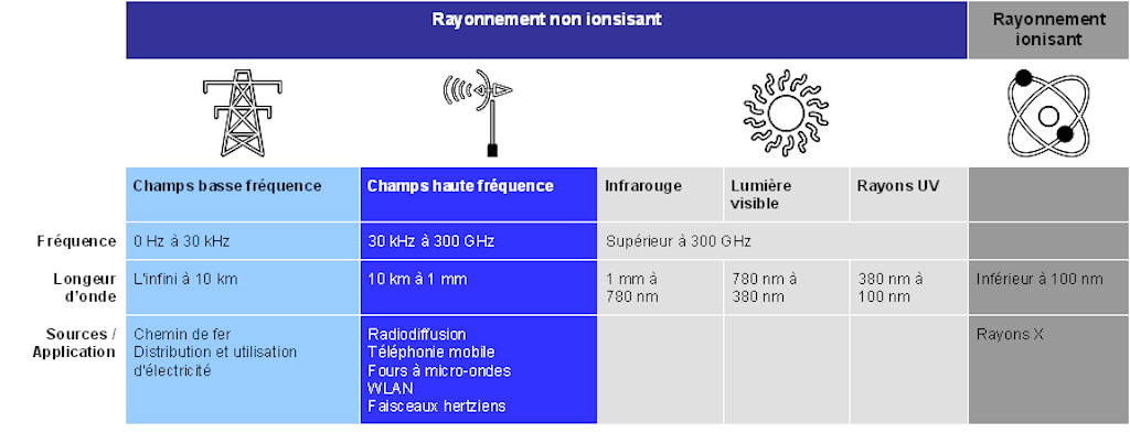 Le terme « électrosmog » est couramment employé pour désigner les champs électriques et magnétiques générés par toute installation technique. Le spectre des fréquences du rayonnement électromagnétique se subdivise en gros en rayonnement ionisant et en rayonnement non ionisant. S’agissant de ce dernier, on distingue le rayonnement basse fréquence, le rayonnement haute fréquence, le rayonnement infrarouge, la lumière visible et le rayonnement ultraviolet.