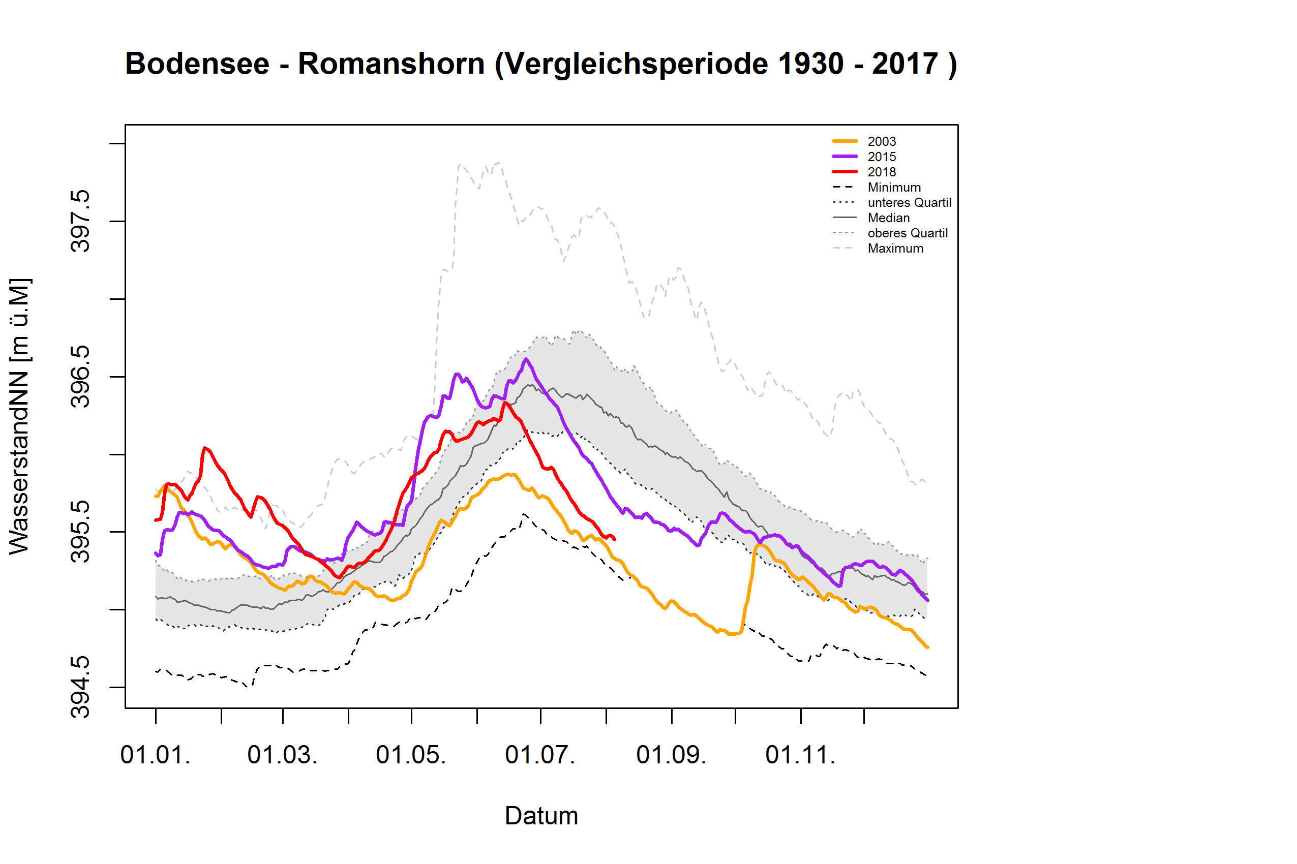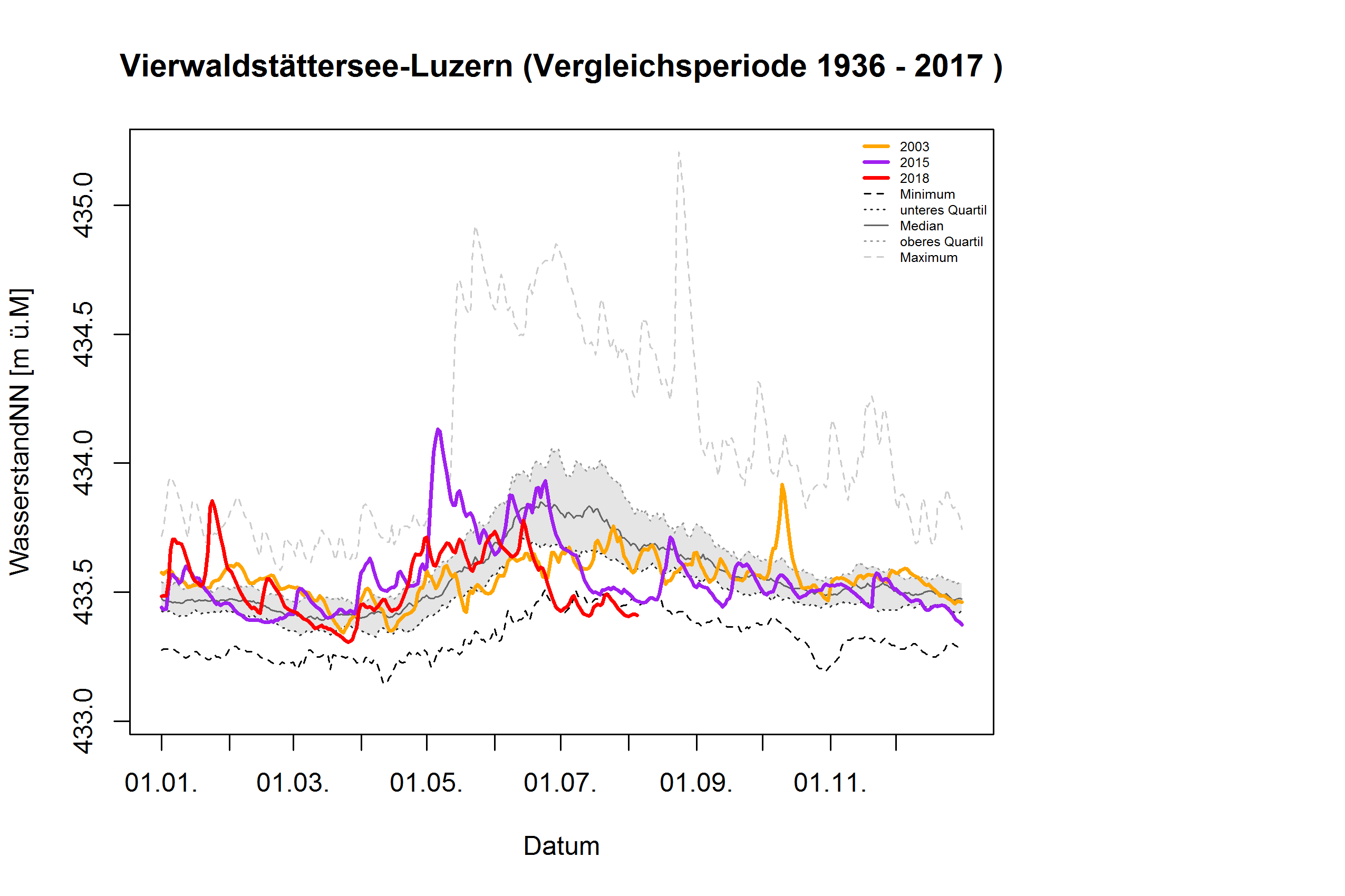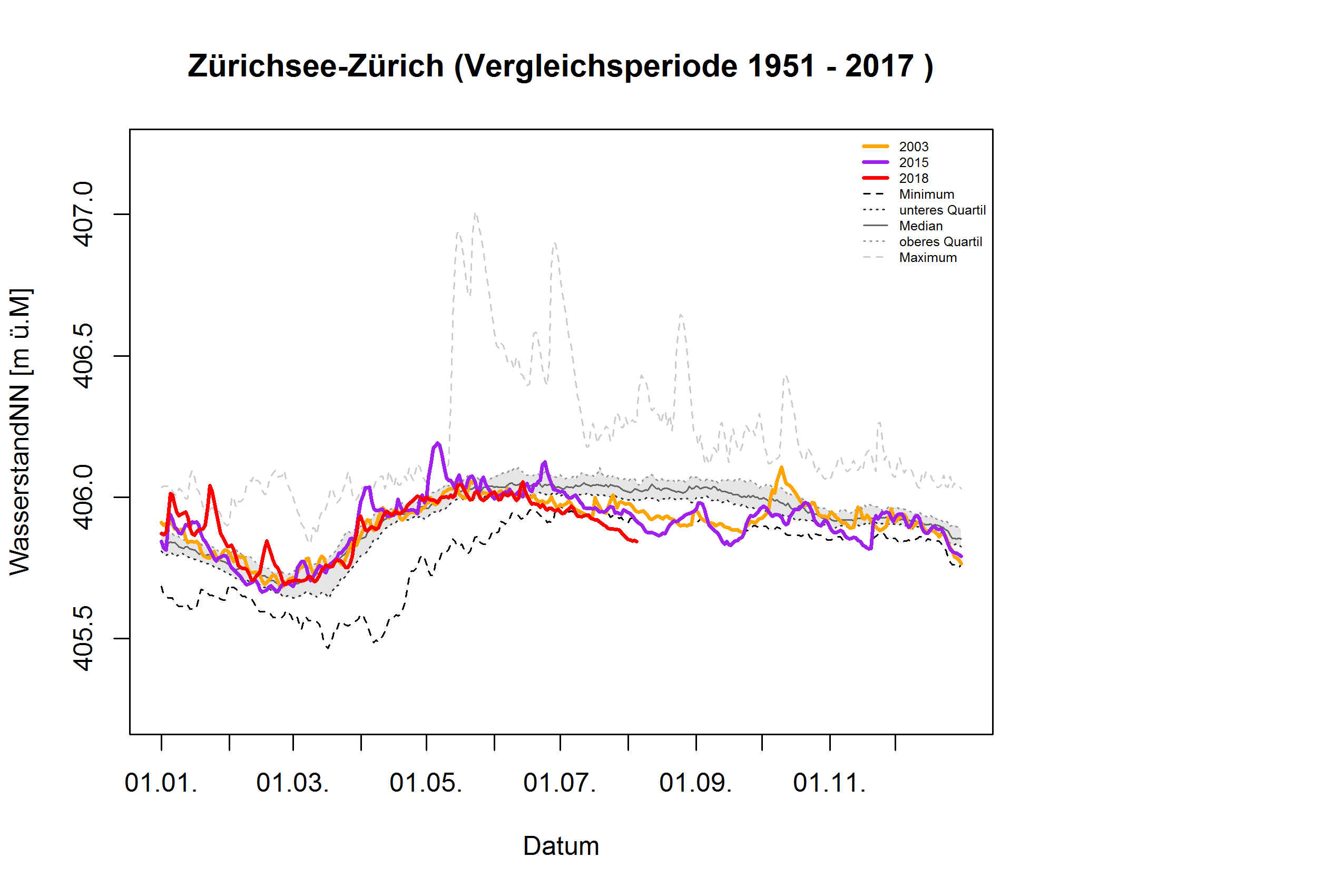 Si les niveaux de certains lacs régulés (lacs de Thoune et de Bienne, p. ex.) sont encore partiellement normaux, ceux des lacs des Quatre-Cantons, de Zoug et de Zurich sont exceptionnellement bas. Le lac de Zurich a ainsi atteint son plus bas niveau enregistré pour un mois d’août depuis 1951 (période de référence). La deuxième semaine d’août, le niveau du lac de Zoug ne se situait plus que quelques centimètres au-dessus du minimum absolu enregistré depuis le début des mesures en 1930 (413,12 m en octobre 1947). Ces niveaux sont donc nettement inférieurs à ceux des mois d’été 2003 et 2015.