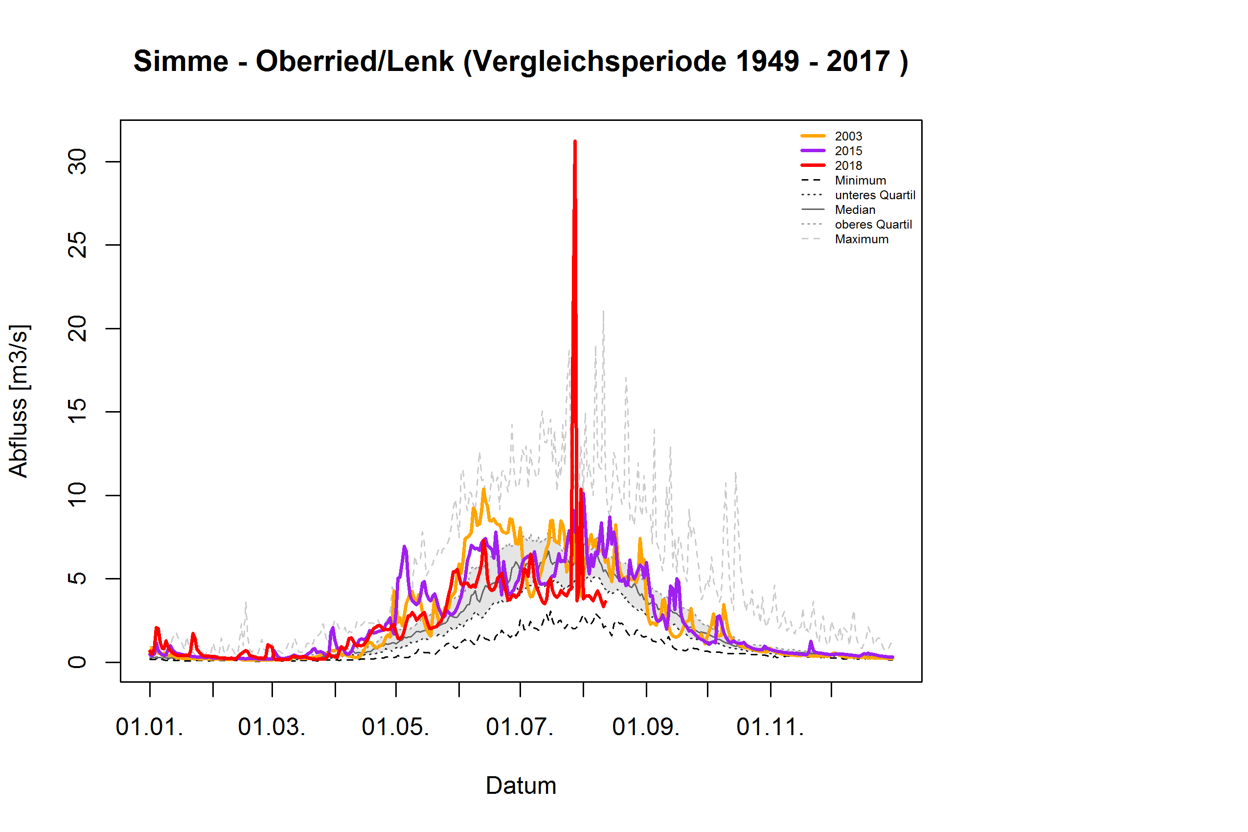 La situation est tout autre dans les bassins versants englacés de haute altitude, où la vague de chaleur a intensifié la fonte des glaciers entre fin juillet et début août. Dans ces régions, on observe actuellement des débits normaux à nettement supérieurs à la moyenne. Au début du mois d’août 2018, les débits de la Massa enregistrés près de Blatten, en Valais, ont atteint à plusieurs reprises des valeurs relevant du niveau de danger 3 (danger marqué). La Simme près d’Oberried/Lenk s’est retrouvée brièvement en situation de crue le 27 juillet 2018, après la vidange du lac de Faverges, situé sur le glacier de la Plaine Morte.