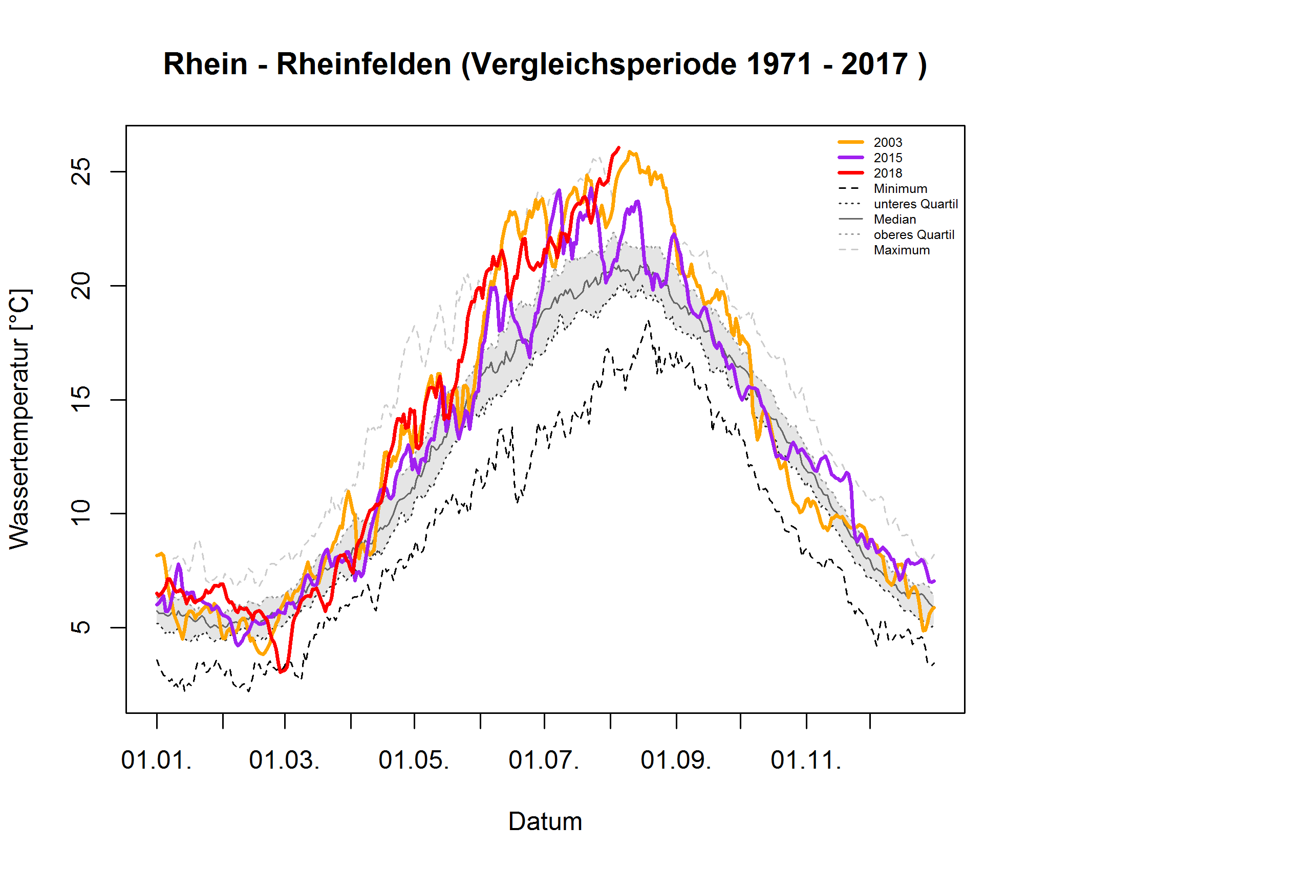 14.08.2018 – L’absence prolongée de précipitations et les températures élevées des semaines passées ont mené à une situation d’étiage marquée dans les lacs et les cours d’eau de Suisse. S’ajoute à cela, début août, une hausse des températures de l’eau supérieure en de nombreux endroits à celles enregistrées en 2003 et en 2015.