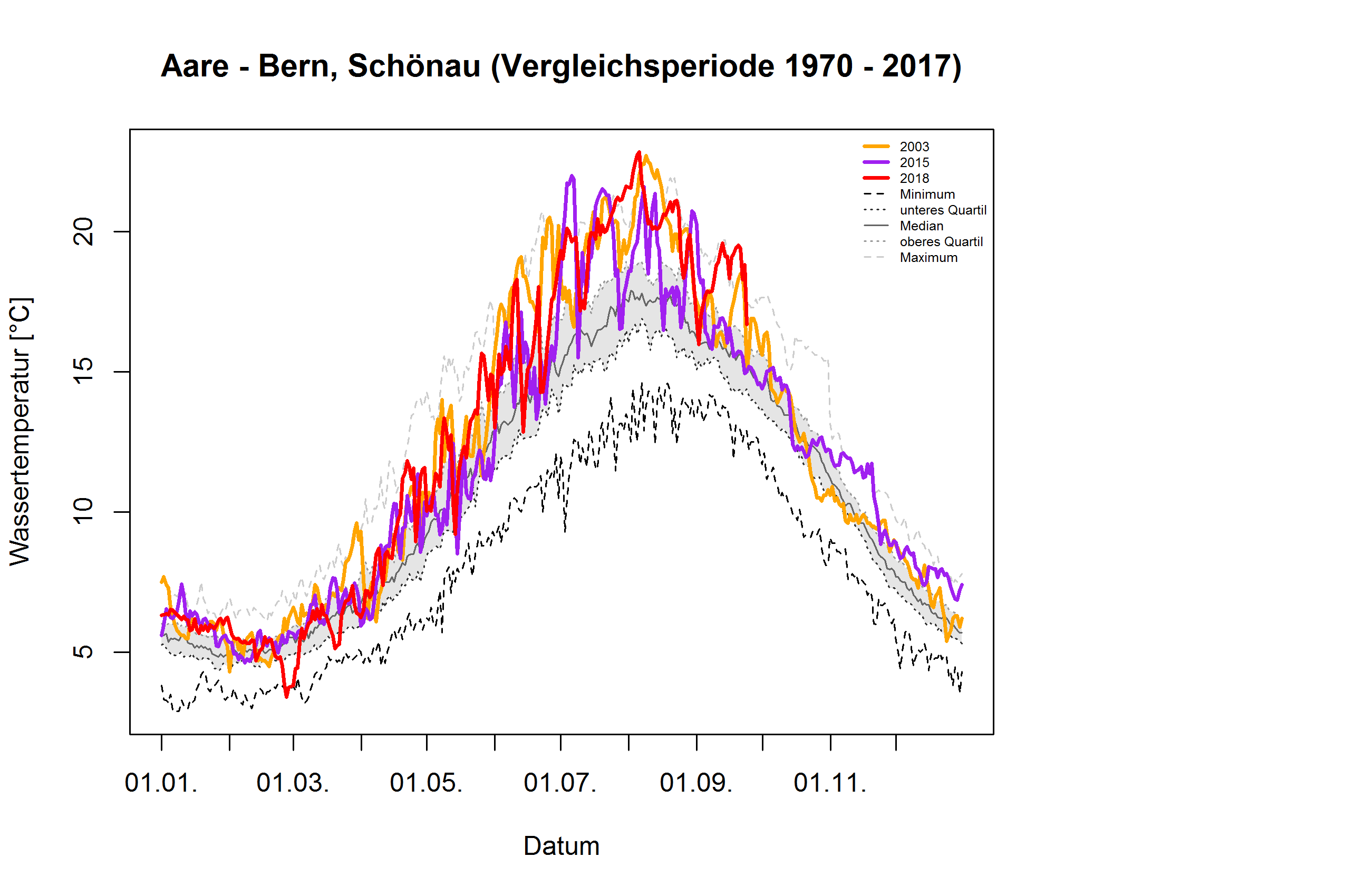 Dans les cours d’eau alimentés en grande partie par les glaciers (p. ex. à la station de mesure Massa-Blatten, située en aval du glacier d’Aletsch), aucun refroidissement particulier n’a été constaté. La situation en 2018 diffère donc de celle de 2003.
